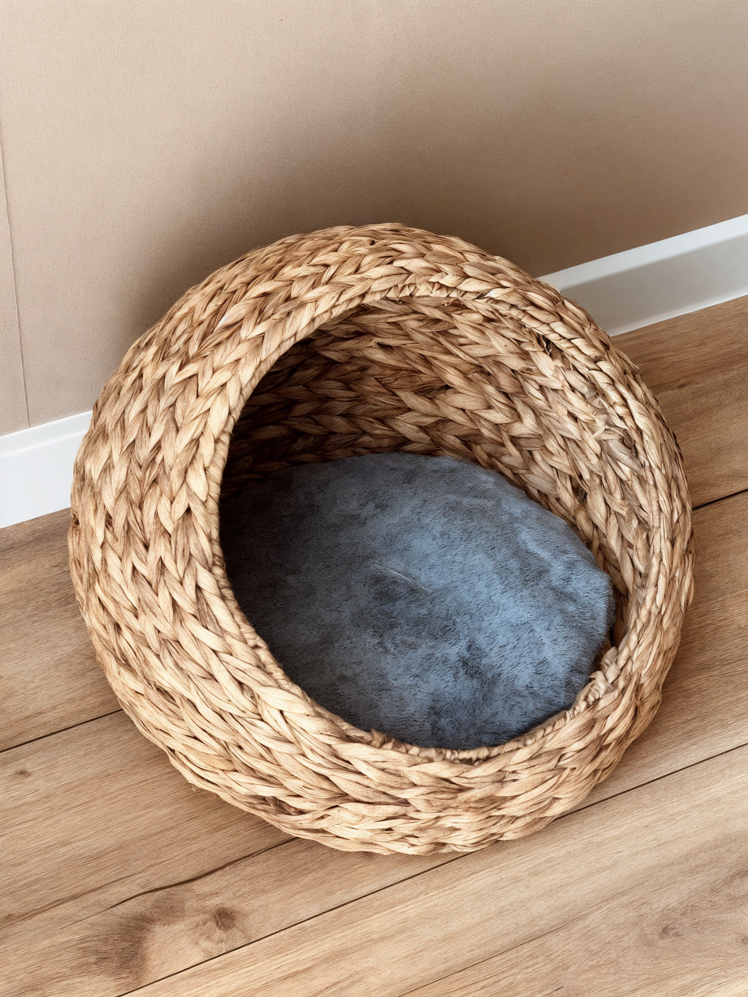 Уютное укрытие для кошек и мелких собак с полузакрытой формой: стены защищают от сквозняков, а широкий вход обеспечивает удобный доступ. Корзина сплетена вручную из прочного водного гиацинта с теплой естественной фактурой, внутри - мягкая подушка серого цвета для комфортного сна. Нейтральный оттенок и аккуратное плетение легко впишутся в любой интерьер - от минимализма до бохо.