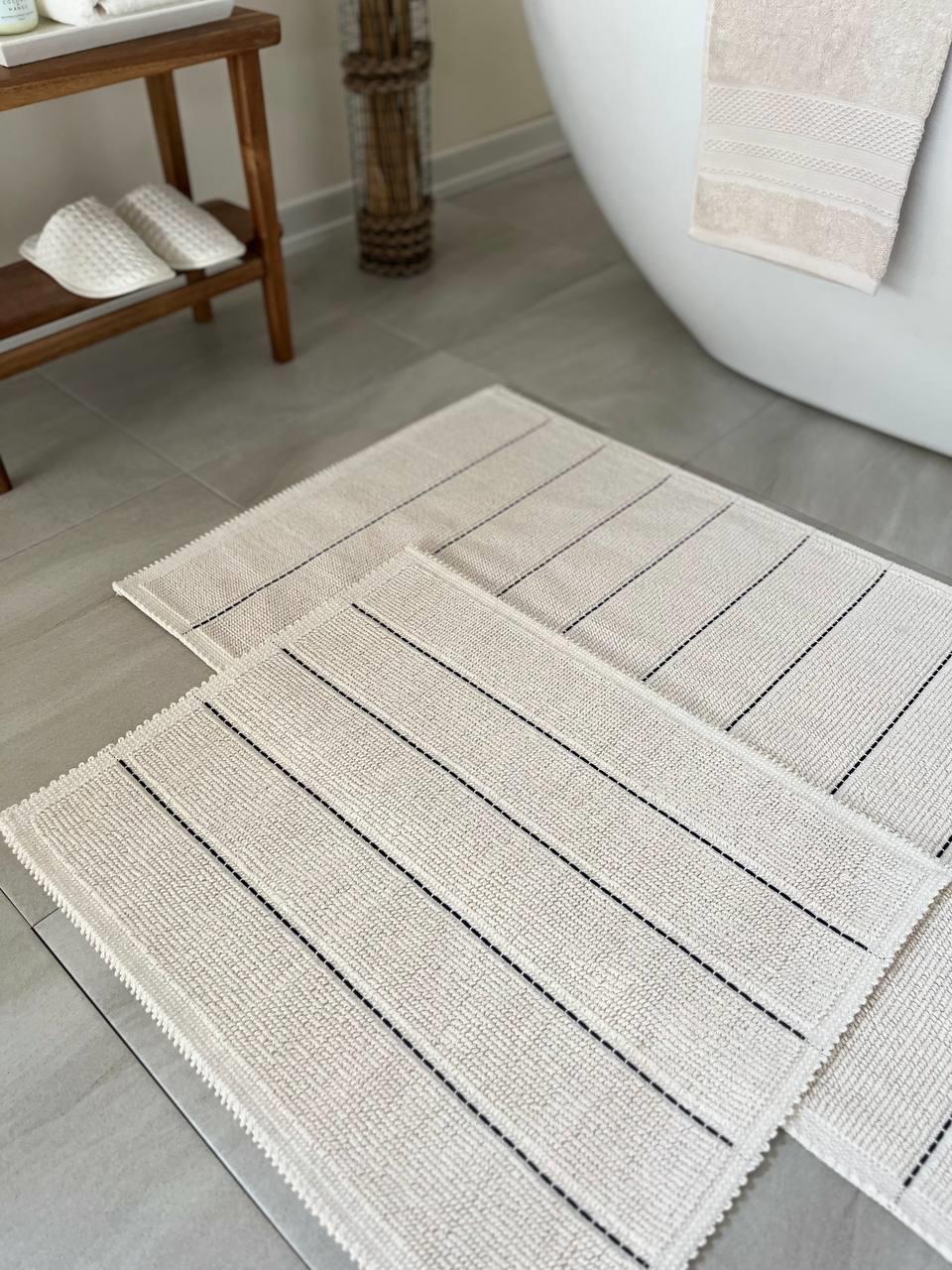 Спокойный природный оттенок прекрасно сочетается с геометрией линий ковриков, что позволяет украсить такими изделиями абсолютно любую ванную комнату.