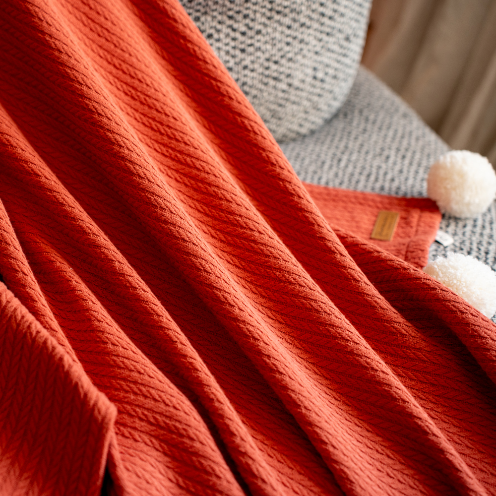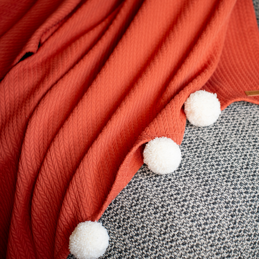 Вязаный плед с помпонами можно использовать как покрывало для кровати ил накинуть на плечи, если замерли. Также данный плед будет отличным дополнением для пикник или в машину.