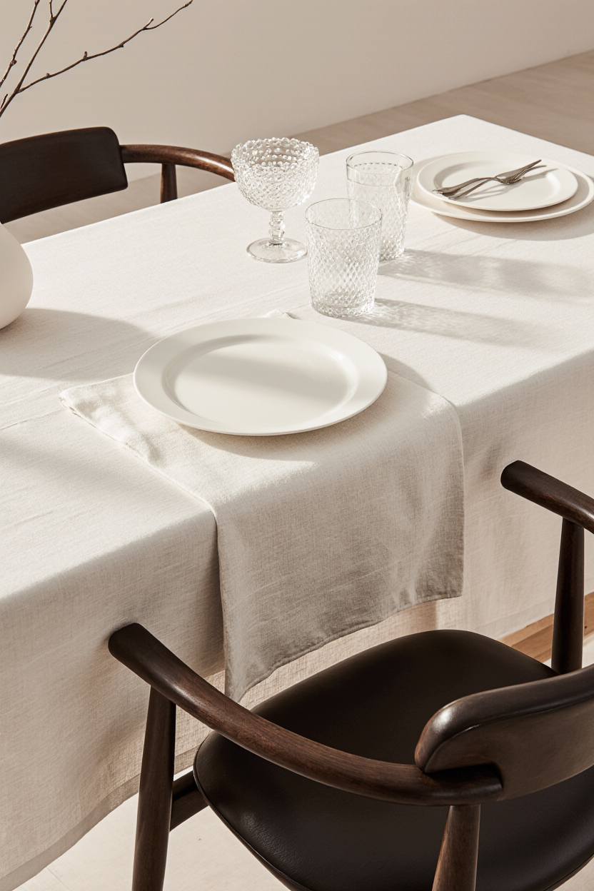 Создайте теплую атмосферу за столом с натуральной льняной скатертью, которая подчеркивает вкус и заботу о деталях.